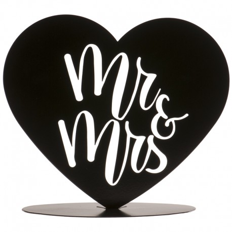 Zajímavá svatební dekorace na dort je toto černé kovové srdce. Umístěno je na podstavci, čímž je zajištěna jeho stabilita. Vyrobeno je ze zdravotně nezávadného materiálu. Tato figurka je vysoká 14,5 cm. Je plně omyvatelná. Nápis Mr. And Mrs. Je vyveden v bílé barvě ozdobným písmem.