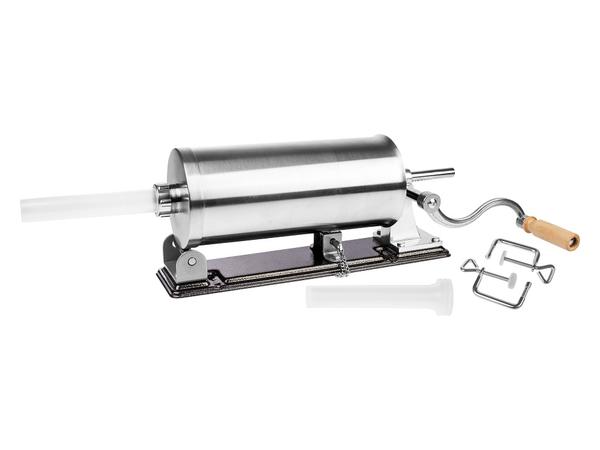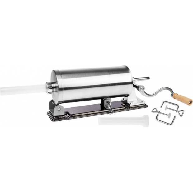 Plnička klobás pro domácí použití. Vyrobena je z nerezové oceli CrNi 18/10. Ruční plnička se může použít na plnění klobás, salámů, párků a dalších pokrmů. Její kapacita je max. 3 kg masa. Plničku snadno umyjete, aby byla připravena kdykoliv k dalšímu použití. Na výběr máte několik nástavců. Plničku jednoduše připevníte k pracovní desce pomocí svorek. V setu jsou 4 plnící trubičky, výtlačný talířek. Trubičky mají průměr průměr 17, 21, 25, 29 cm. Připravit si domácí klobásky, uzeniny či salám znamená mít doma potraviny s bohatou masovou chutí, bez konzervantu, chemických plnidel a dalších přísad. Tyto potraviny však mají kratší datum spotřeby než je běžné u výrobků z obchodů. Jsou vhodné i pro děti. S domácí plničkou se pracuje velice snadno, zvládne to i začátečník. Díky kvalitnímu materiálu vám poslouží po dlouhá léta. Využít ji můžete i při výrobě vánočního cukroví.
