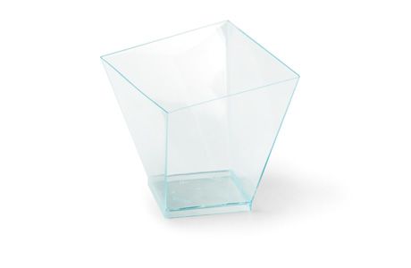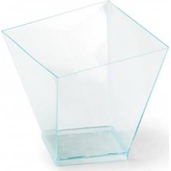 Hranatý pohár má zkosené strany a díky výrobnímu materiálu (PS), který připomíná plexisklo a má zelenkavý nádech se v něm zajímavě odráží světlo a vytváří se duhové odlesky. Pohár vydrží teploty max. 40°C. Neservírujte v něm horké pokrmy. Rozměry: 7,2 x 7,2 x 7,9 cm.