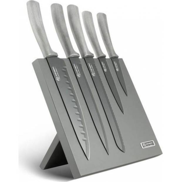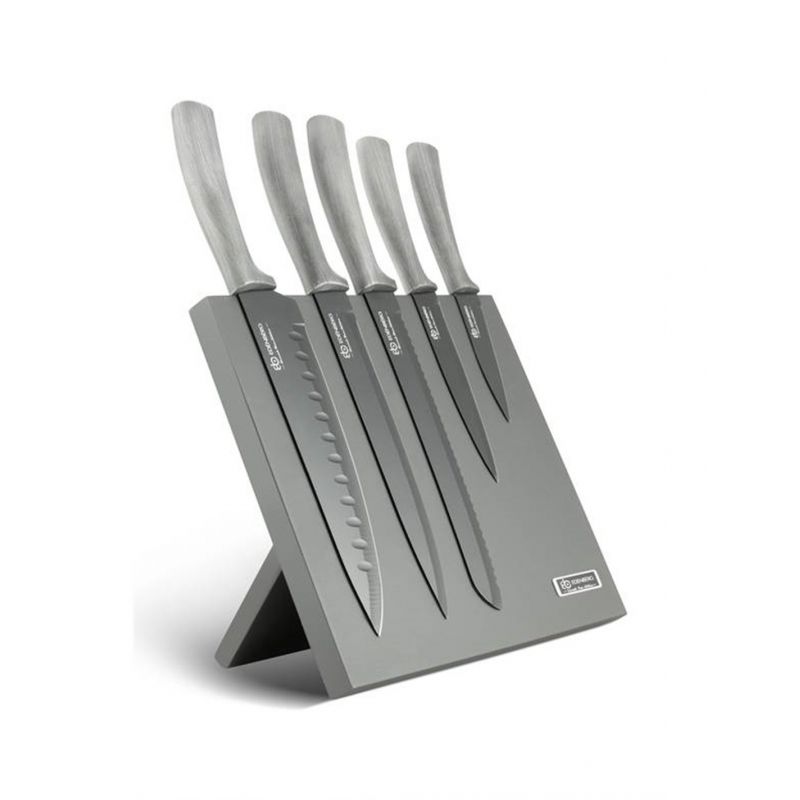 Moderní a praktická sada 6 nožů s magnetickým stojánkem. Vyrobeno z vysoce kvalitní uhlíkové oceli Ergonomické rukojeti zajišťují pohodlné používání Estetický stojan, celková výška 30 cm Perfektní nástroje pro vaření a kulinářství každý den. Dobrý nůž je základem práce každého kuchaře a šéfkuchaře, bez ohledu na to, zda se o svůj talent dělí s pár členy rodiny, nebo s tisíci hostů, kteří pravidelně navštěvují jeho restauraci.