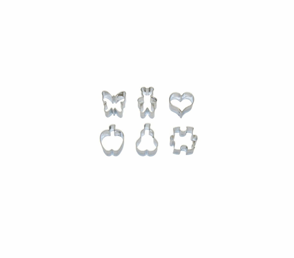 Perfektní sada k vykrajování středů u větších kousků při přípravě slepovaného cukroví. Sada obsahuje vykrajovátka ve tvaru hruštičky, jablíčka, medvídka, motýlka puzzle a srdíčka o rozměrech 19-20 mm. Vykrajovátka jsou vyrobena z pocínovaného plechu. Výška plechu je 16 mm.