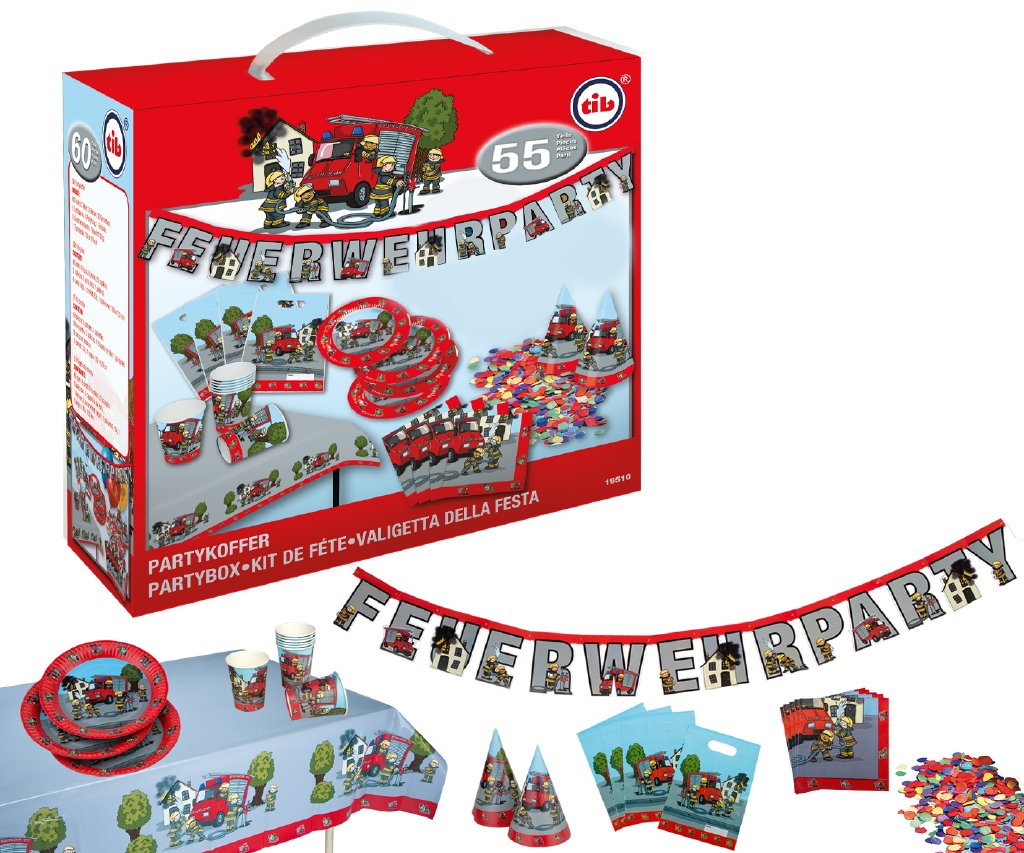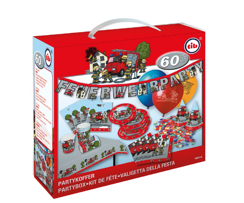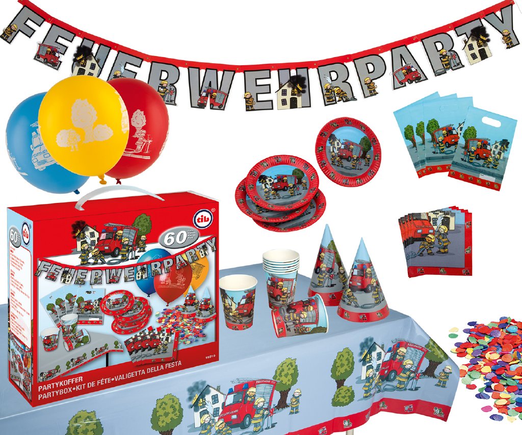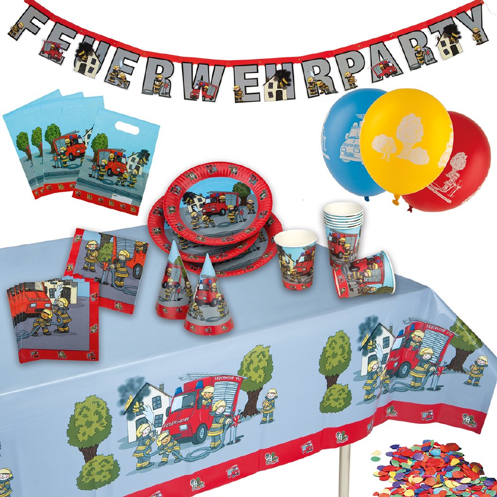 Párty set s motivem Hasiči je svými 60 díly určen pro 8 malých hasičů. Součástí dodávky je 8 papírových kelímků a papírových talířků, 20 ubrousek, 8 společenských klobouků, 5 potištěných balónků, girlanda, 8 dárkových sáčků k naplnění, balení barevných konfet (cca 10 g) a ubrus (cca. 180 x 120 cm). Motiv přirozeně zobrazuje odvážné hasiče v akci.