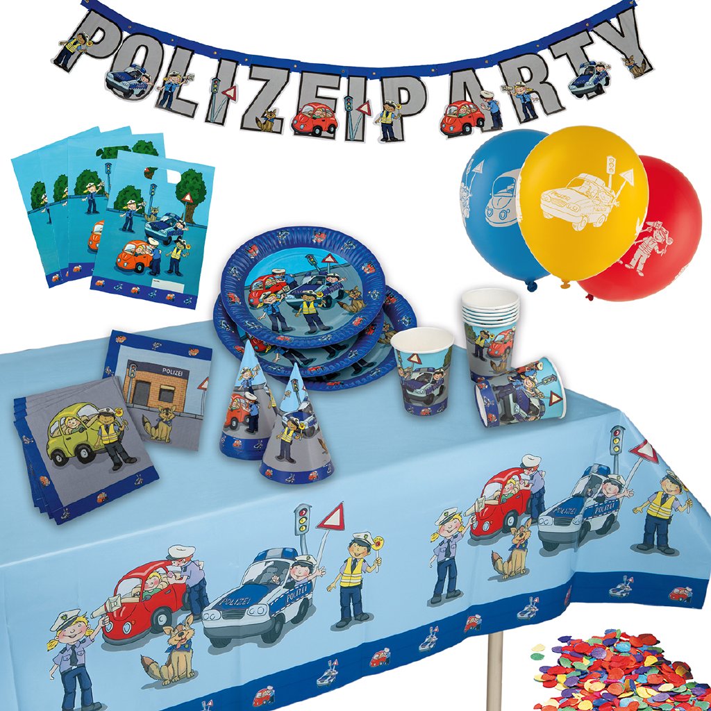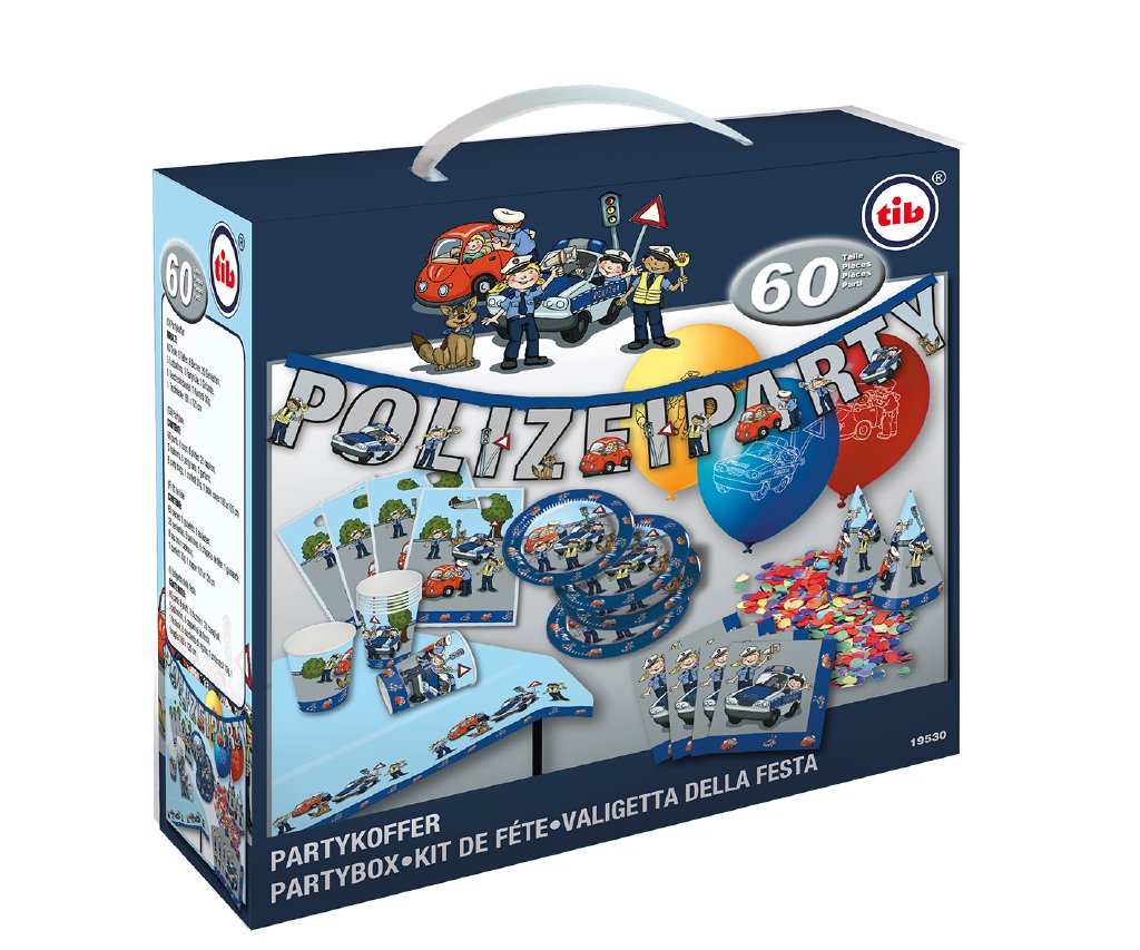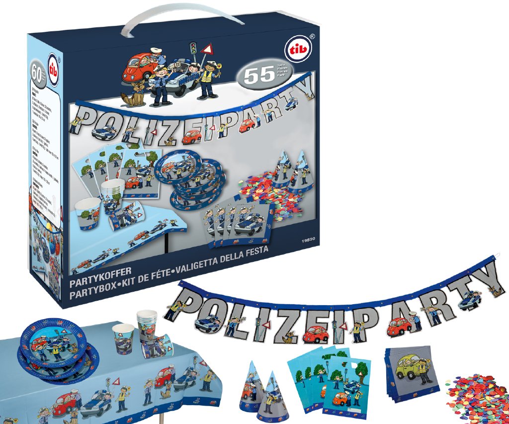 Párty set s motivem policie je svými 60 díly určen pro 8 malých hasičů. Součástí dodávky je 8 papírových kelímků a papírových talířků, 20 ubrousek, 8 společenských klobouků, 5 potištěných balónků, girlanda, 8 dárkových sáčků k naplnění, balení barevných konfet (cca 10 g) a ubrus (cca. 180 x 120 cm). Motiv přirozeně zobrazuje odvážné policisty v akci.