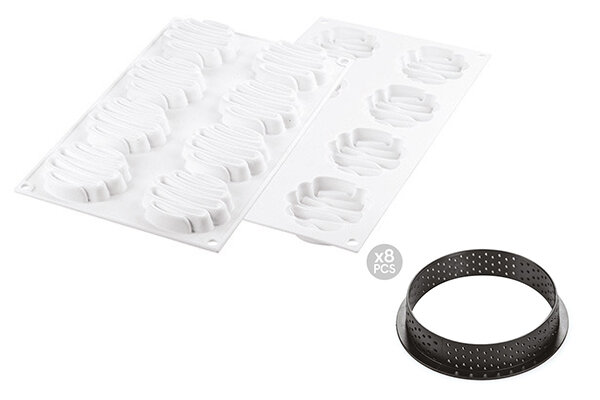 Nový způsob, jak navrhnout tartaletku a učinit tento tradiční dezert ještě elegantnějším. Tato sada se skládá ze dvou různých prvků. 8 malých děrovaných koleček na tartaletky a 8 silikonových forem s velmi jemným designem.