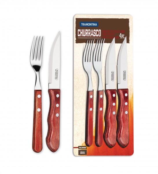 Grilování je oblíbenou kratochvílí po celém světě. Brazilská firma Tramontina nabízí 4-dílné příbory z kvalitních materiálů, takže šťavnaté grilované jídlo lze také stylově krájet. Extrémně tvrdá čepel vyrobená z nerezové oceli (AISI 420, odpovídá DIN 1.4028) zaujme svojí dlouhou hranou. Rukojeti nože i vidličky jsou vyrobeny ze speciálního dřeva. Toto dřevo, vyrobené z několika vrstev borovicového dřeva impregnovaného a lisovaného pryskyřicí, je mimořádně odolné, odolné vůči nárazům, necitlivé na teplotu a bezpečné do myčky. I po častém používání vypadá sada příborů na grilování elegantní a nová.