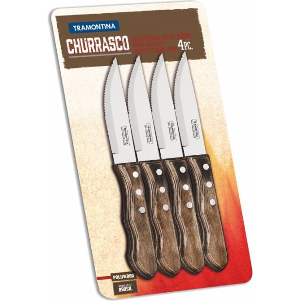 Neznáme nic hezčího, než sedět spolu v uvolněné atmosféře a užívat si grilování chutného masa. Společnost TRAMONTINA nabízí správné krájecí nástroje, aby bylo možné stylově krájet i šťavnaté kousky masa. Čtyřdílná sada nožů na jumbo steaky vyrobená z nerezové oceli AISI 420 (odpovídá DIN 1.4028) je vyrobena ze zvláště tvrdé oceli a díky své délce zaujme. Robustní rukojeti vyrobené ze skutečného dřeva jsou odolné proti nárazům, vysokým teplotám a také umožňují čištění v myčce na nádobí. Rukojeti se skládají z několika vrstev borovicového dřeva, které jsou napuštěny pryskyřicí, lisovány, řezány a leštěny. Nože mají 12,5 cm dlouhou čepel. Jsou baleny v blistru.