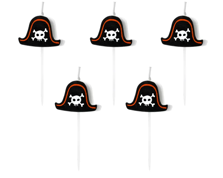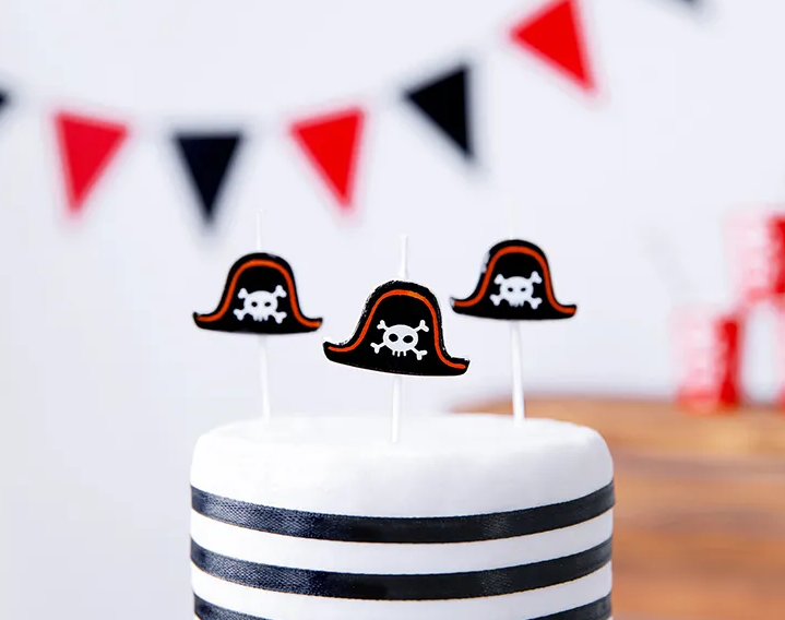 Sada svíček ve tvaru pirátských klobouků je ideální pro tématické zdobení dortů. Balení obsahuje 6 ks svíček, každá má průměr 2,5 cm.