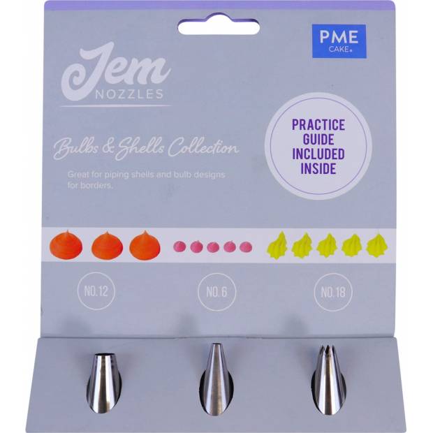 Tato 3dílná sada trysek profesionální kvality vám pomůže snadno vytvořit nádherně rozmanité a velkolepé dekorace pro vaše dorty a zákusky. Sada obsahuje: Trysku č. 12 - Trubkové žárovky a vedení. Skvělé pro použití s různými médii, jako je máslový krém; Tryska č. 6 - Trysky rovné a zvlněné s touto malou okrajovou tryskou; Tryska č. 18 - Trysky S a C pro různá provedení nebo zdobení kolem okraje.Snadné použití: Skvělé pro profesionálního nebo domácího pekaře. Nejlepších výsledků dosáhnete při použití s PME zdobícími vaky nebo spojkami. Vyrobeno z vysoce kvalitní bezešvé nerezové oceli. Umyjte je teplou mýdlovou vodou.