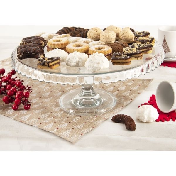 Podnos na nožce s ozdobným okrajem – skvělý pro servírování bábovky, muffinů, dortů, zákusků… Materiál: sklo. Rozměry: pr. 32 cm, v. 11,5 cm. Můžete ho doplnit skleněným poklopem z naší nabídky – 128356 nebo 128328.