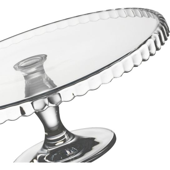 Podnos na nožce s ozdobným okrajem – skvělý pro servírování bábovky, muffinů, dortů, zákusků… Materiál: sklo .