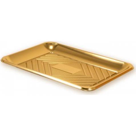 Zlatý servírovací tác. Rozměry 27 x 19 cm.