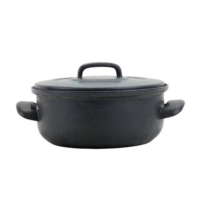 Velký smaltovaný pekáč s nerezovými rukojeťmi.
