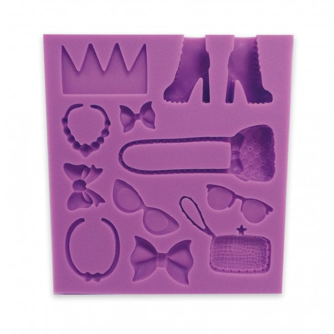 Tato nová sada forem na příslušenství od Sweet Revolutions umožňuje snadné vytváření roztomilých doplňků pro vaše figurky a modely dortů. Sada příslušenství zahrnuje: Koruna, boty, kabelka, mašle, sluneční brýle, náhrdelník a kabelka. Formy jsou univerzální a lze je použít s jakoukoli kvalitní modelovací pastou nebo cukrovou pastou. Může být také použit s květinovou pastou, modelovací čokoládou a marcipánem. Každá forma je vyrobena z vysoce kvalitního potravinářského silikonu, speciálně navrženého pro pomoc při výrobě bezchybných dortových dekorací.