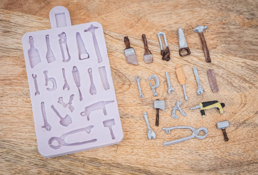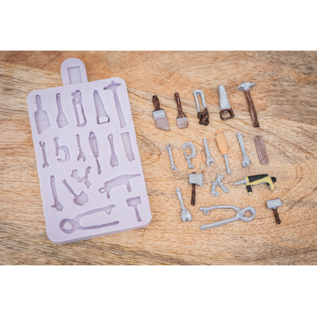 Silikonová forma „Miniaturní nářadí“ od značky Karen Davies, ideální pro vytváření realistických cukrářských dekorací ve tvaru malých nástrojů. Vyrobeno z flexibilního potravinářského silikonu pro precizní výsledky při použití s fondánem, marcipánem, model