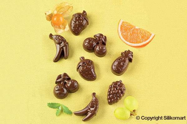 Forma na přípravu krásně zdobených bonbonků ve tvaru veselého ovoce je velmi pružná a nepřilnavá, takže z ní čokoládky vždy snadno vyloupnete. Pro inspiraci najdete v sadě i recept na přípravu čokoládových pralinek. Rozměry jednotlivých bonbonků jsou: ananas 38 x 22 x 15 mm, jahoda 35 x 25 x 15 mm, hrozno 35 x 23 x 15 mm, třešně 36 x 31 x 15 mm, banán 40 x 27 x 15 mm. Objem formy je 91,2 ml.