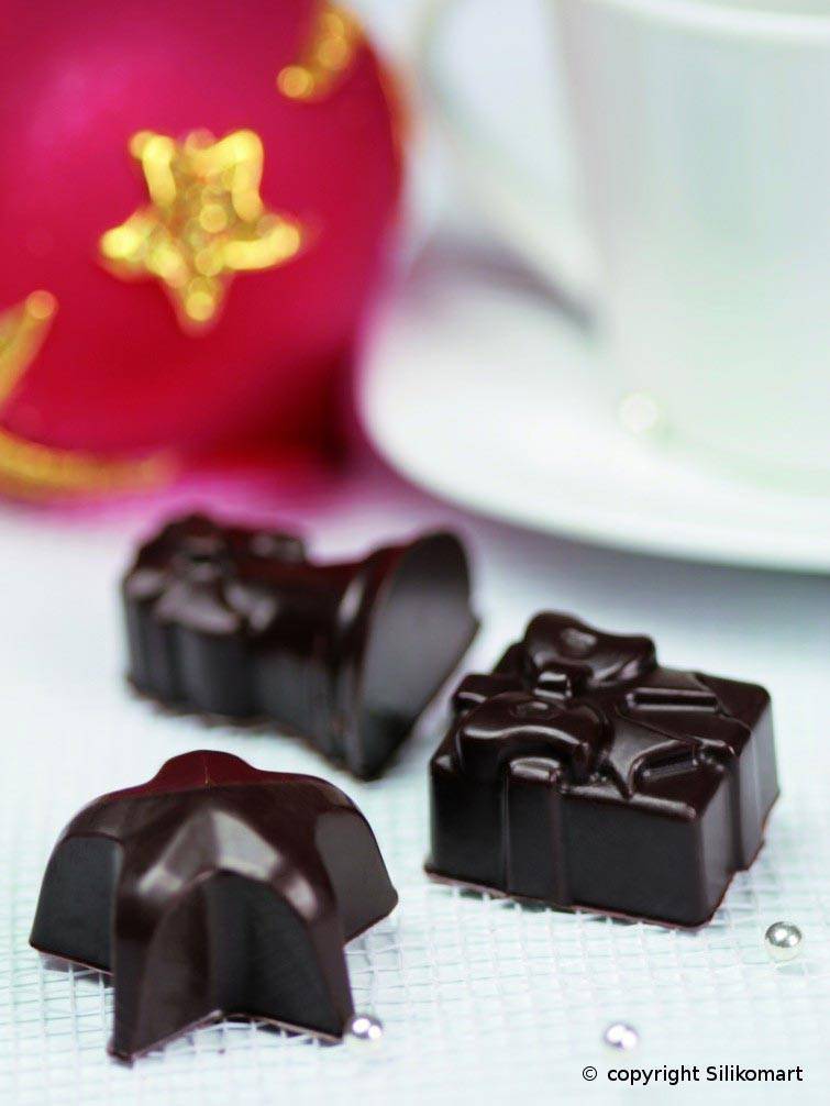 Forma má tři do detailů propracované motivy s vánoční tématikou: dárek s mašlí, hvězdu, a andílka. Rozpuštěnou čokoládou naplňte formu, přebytek setřete stěrkou a formou poklepejte o pracovní desku, aby v čokoládě nebyly bublinky. Čokoládky dejte ztuhnout do chladu (forma vydrží teploty do -60°C). Bonbony jsou po vyloupnutí krásně lesklé a hladké díky nepřilnavosti kvalitního silikonu.
