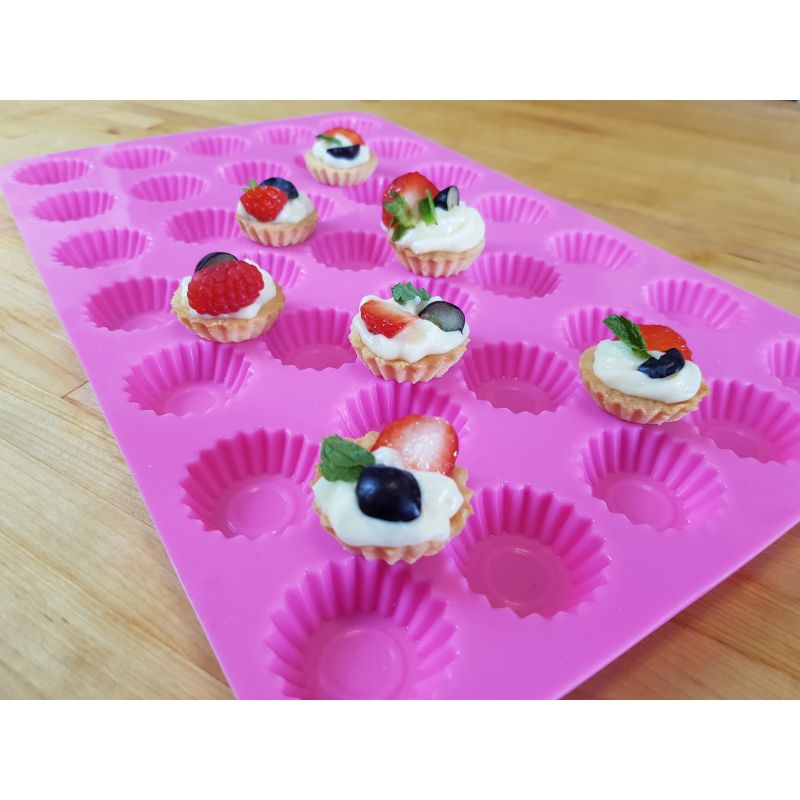 Forma na pečení mini košíčků je naprostou novinkou na trhu. Forma má rozměr zhruba 34,5 x 21,8cm. Jednotlivý košíček má vrchní průměr 37mm a hloubku 13mm, dno košíčků má průměr zhruba 28mm. Na formě je 35ks košíčků stejné velikosti. Forma je celá ze silikonu, odolá tedy teplotám -40C a +230C, výrobce uvádí přímo na formě teploty i o něco vyšší. Nicméně se tedy v této silikonové formě na košíčky, může nejen péct, ale i mrazit, použít jí lze třeba na čokoládové bonbóny, želatinu, popřípadě Isomalt. Uplatnění tedy najde všude tam, kde tvar mini košíčku využijete a to třeba i ve slané kuchyni. Při pečení je dobré formu položit na rovný plech. Před použitím je dobré formu prolít vodou – voda se během pečení odpaří a tím se stane forma nepřilnavou. Na formu nepoužívejte ostré předměty, mohla by se poškodit proříznutím. Košíčky se nepečou pouze na Vánoce či Velikonoce, určitě Vám ulehčí práci i při pečení svatebních košíčků, popřípadě jsou skvělé, jako jednohubky na oslavu či venkovní párty. Tuto silikonovou formu ve tvaru mini košíčků si zamiluje opravdu každý, skvěle se s ní pracuje, navíc i krásně vypadá – její růžová barvička je nepřehlédnutelná a jistě se bude líbit každé hospodyňce.