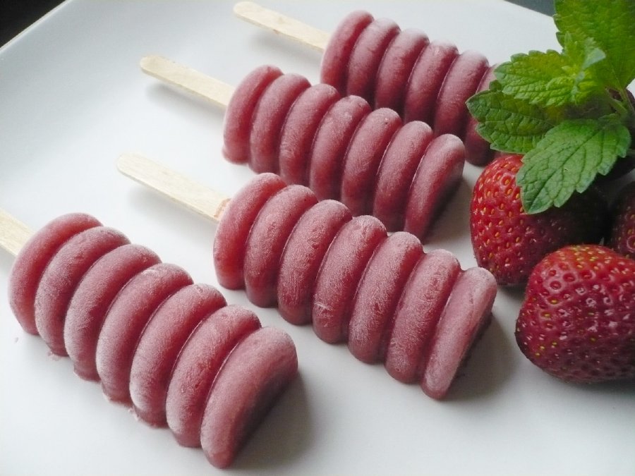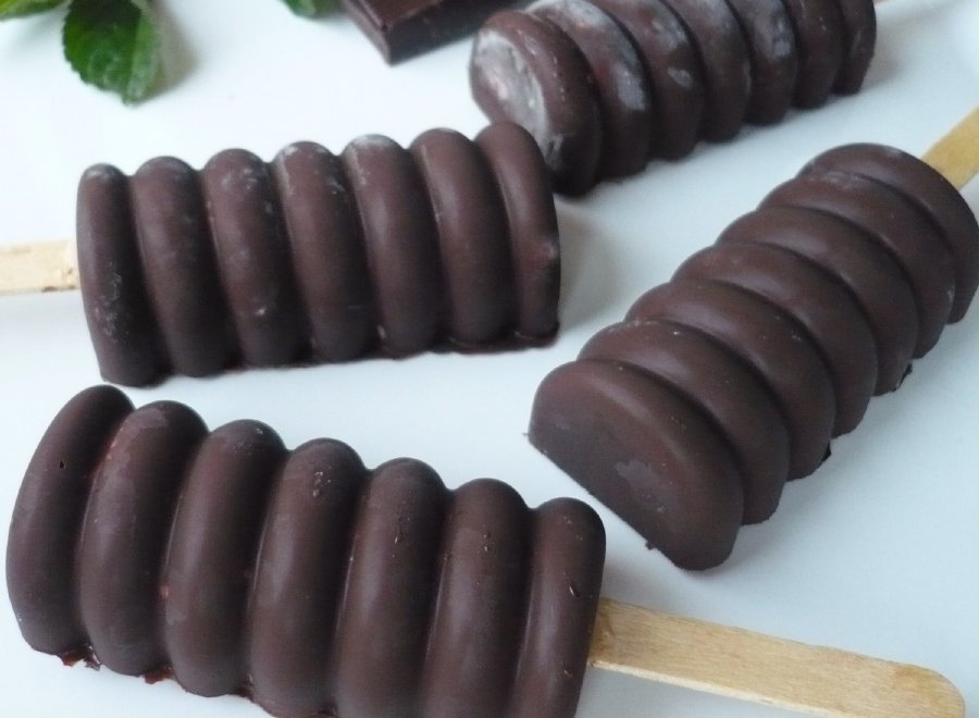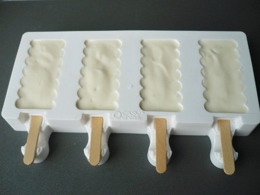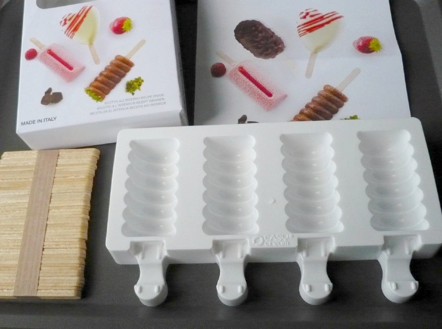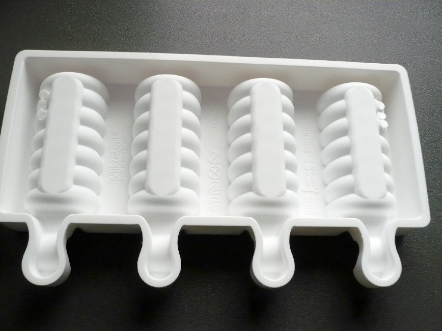 Měla jsem možnost používat formu delší dobu. Pracuje se s ní velice dobře, je pevnější, neprohýbá se a místo v mrazničce se pro tento typ formy vždy najde. Je velice kvalitní, vyrobená ze 100% platinového silikonu. Snáší teploty od -60 až po + 230°C. Lze ji umývat v myčce nádobí. V sadě s formou je 50 ks dřívek, ty lze pak zakoupit v eshopu i zvlášť. Forma je o velikosti 20 x 9 cm, ale pokud ji změříme i s výstupky určenými na přidržení dřívek, tak měří 20 x 11,7 cm. Jeden nanuk je o objemu 35 ml, což je dostačující množství. Připravenou směsí naplníme prohlubně, zasuneme dřívka a necháme důkladně zmrazit. Pokud je směs řidší, tak se dřívka vkládají jako první. Nanuky jdou velice dobře vyjmout, z formy se jakoby vyloupnou. Pokud je nespotřebujeme všechny najednou, nebo záměrně uděláme postupně větší množství, tak se moc dobře skladují v dobře uzavíratelném plastovém boxu. Hotové nanuky se dají namáčet do rozpuštěné čokolády, ale mně se spíš osvědčil opačný postup. Rozpuštěnou čokoládu do prohlubní naneseme štětcem a necháme ztuhnout. Můžeme ještě jednou zopakovat, čokolády bude silnější vrstva. Hned můžeme vložit dřívka. Pak naplníme směsí, vložíme do mrazničky a když nanuky zmrznou, tak je ještě ve formě potřeme rozpuštěnou čokoládou shora. Ztuhne rychle, nanuky můžeme po chvíli vyjmout.