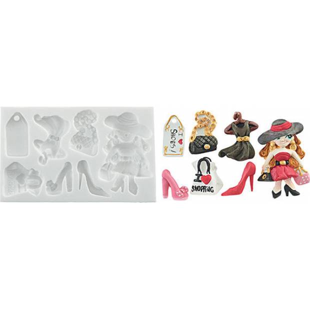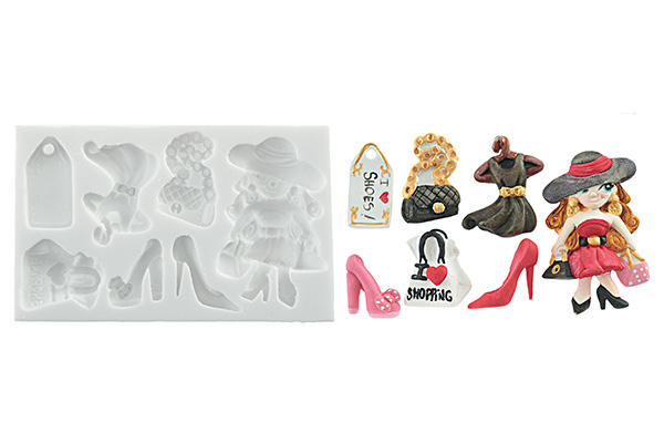 Silikonová forma na tvarování ozdob a přípravu čokoládových bonbonků ve tvaru panenky a módních doplňků.