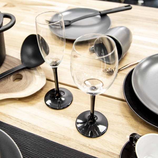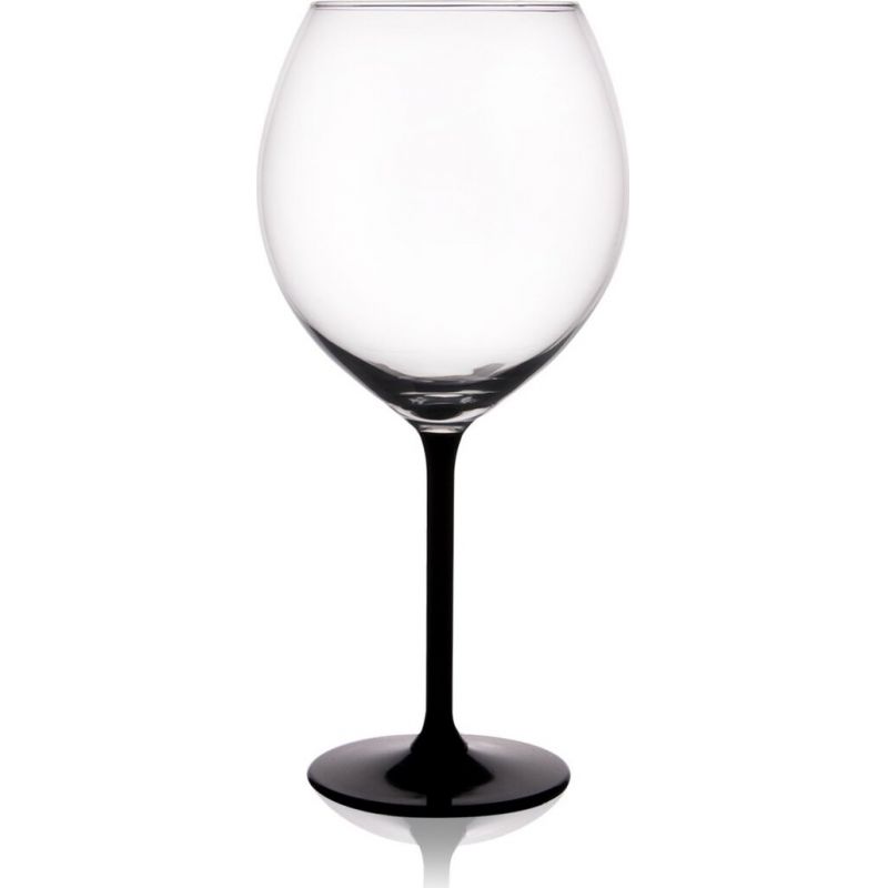 Plný kalich je posazen na dlouhé nožce z černého skla, díky které se sklenice plněná cca do 2/3 objemu dobře drží a víno od rukou tolik neteplá.