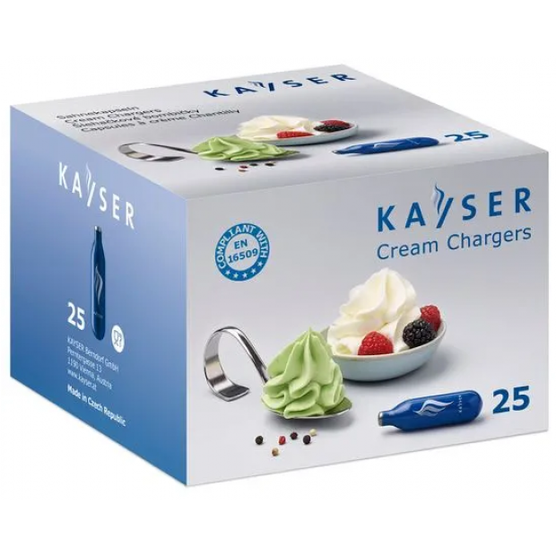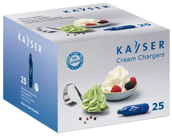 Univerzální bombičky šlehačkové jednorázové jsou vyrobeny v Česku. Jsou vhodné pro tyto modely šlehačkových lahví: Například: Kayser, Tescoma (prodej/model od roku 2017), Liss, Mosa, Hendi, ISI, Orion, Banquet (prodej/model od roku 2019) a dalších značek. Na ušlehání 0,5 l smetany je potřeba pouze 1 bombička. Čistota plynu N2O v bombičce: 99,95 %. Bombičky na šlehačku jsou vyrobeny z recyklovatelné oceli. Tento model je v modré barvě. Nejsou určeny k opakovanému plnění.