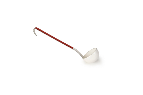 Velká naběračka o průměru 9 cm je vyrobená z kovu a má smaltovaný povrch. Má bílou barvu a červenou rukojeť. Naběračku můžete zavěsit pomocí háčku. Vhodná na mytí v myčce.
