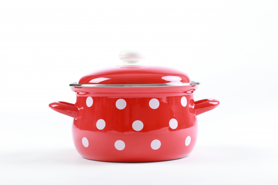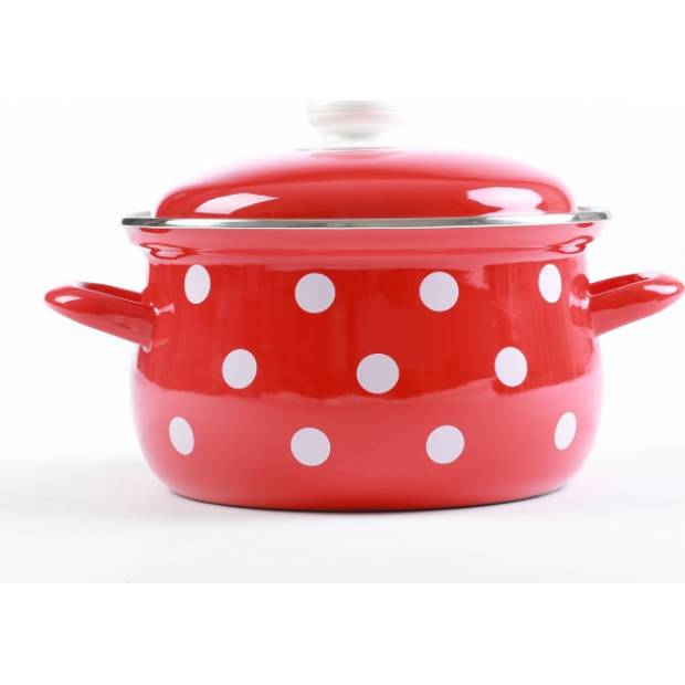 Nádobí s dekorem bílého puntíku si jistě pamatujete ještě z dob vašich babiček. Tento starý vzor oživila firma Belis i na svém smaltovaném nádobí. Puntíky jsou velikostně přizpůsobeny rozměrům nádobí. Vytvořit si můžete celou sadu tohoto jedinečného nádobí. Smaltovaný hrnec o objemu 2,1 l a o průměru 16 cm využijete pro přípravu těch nejlepších pochoutek pro celou rodinu. Plech, ze kterého je hrnec vyroben, je 1 mm silný. Toto nádobí lze používat v myčce nádobí, v troubě i na indukci. Součástí hrnce je rovněž praktická poklice s plastovým úchytem.