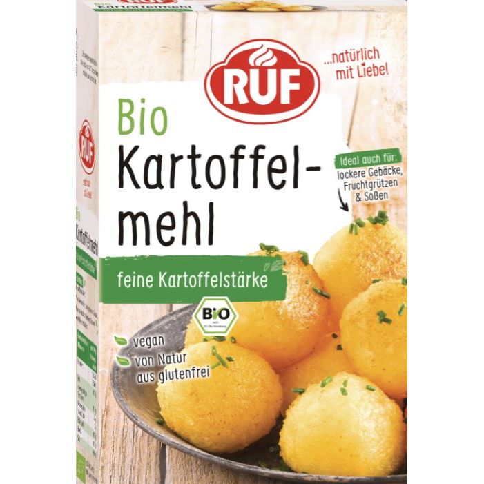 Ruf Bio bramborová mouka je osvědčená pomůcka při vaření a pečení. Skvěle se hodí k zahušťování polévek a omáček nebo k vytvoření obzvláště nadýchaných pečicích kreací. Bramborová mouka není mouka v tradičním slova smyslu (jako je pšeničná mouka). Je to čistý přírodní škrob z vybraných brambor, a proto je také známá jako bramborový škrob. Příprava: BIO bramborovou mouku RUF vždy vmíchejte do studené tekutiny, poté přidejte do horkého jídla a krátce povařte. Je ideální na pečení bramboráků, koláčů, dortů, sušenek a sladkého pečiva. K vaření bramborových knedlíků, jako pojivo do omáček. Do dezertů jako pojivo ovocných pokrmů a krémů. Pro obzvláště jemné koláče, dorty a pečivo nahraďte cca. 1/3 množství pšeničné mouky uvedeného v receptu s BIO bramborovou moukou. Dávkování: Množství bio bramborové mouky potřebné na 500 ml tekutiny: Polévky: 15-20 g Omáčky: 20-25 g Krémy: 25-35 g Pudinky a ovocné pokrmy: 35 - 45 g. Další informace: Skladujte na suchém místě bez zápachu.