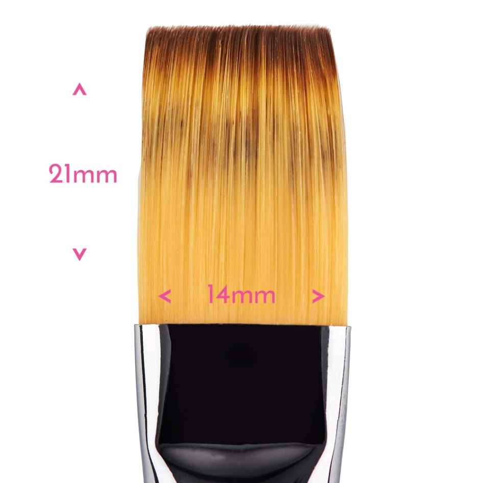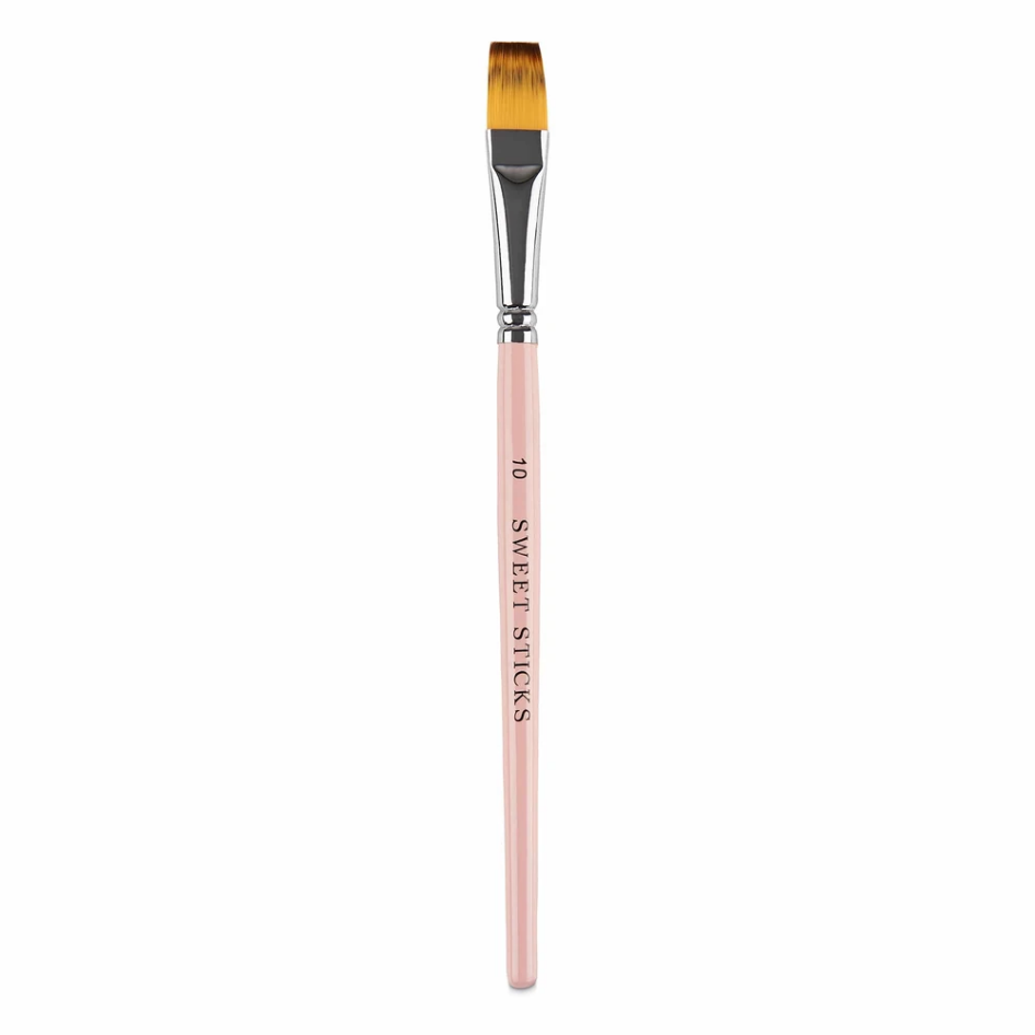 Ploché štětce mají hranatý konec se středně dlouhými až dlouhými štětinami. Jsou skvělé pro široké tahy, kde chcete hodně krytí barvy. Pokud pracujete na povrchu, kde by mohl být klasický štětec příliš velký, plochý kartáč vám poskytne vynikající pokrytí a zároveň vám poskytne o něco větší kontrolu. Ploché štětce lze také použít pro tlusté až tenké čáry, ale pro mnoho lidí je lepší zkosený štětec, který poskytne trochu více pohodlí a kontroly při práci na vzpřímeném dortu.