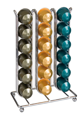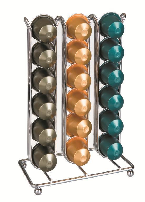 Jednoduchý a praktický stojan na kapsle kávovaru Nespesso nezabere mnoho místa a vy vždy budete mít dokonalý přehled o tom, kolik kapslí jakého druhu máte k dispozici. Přestaňte kapsle skladovat v různých krabičkách a dózách!