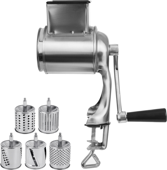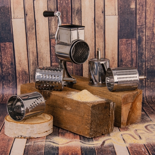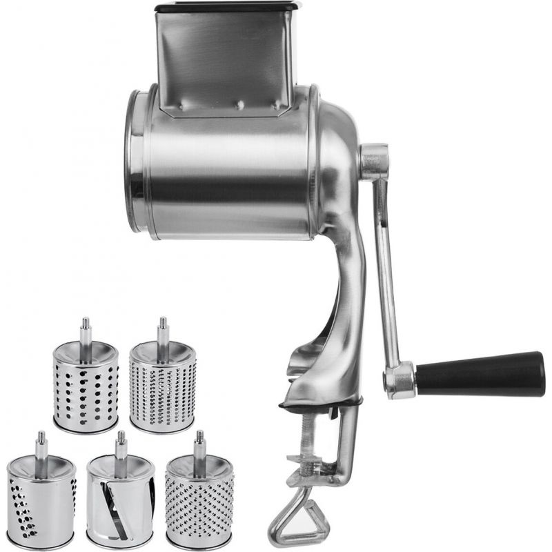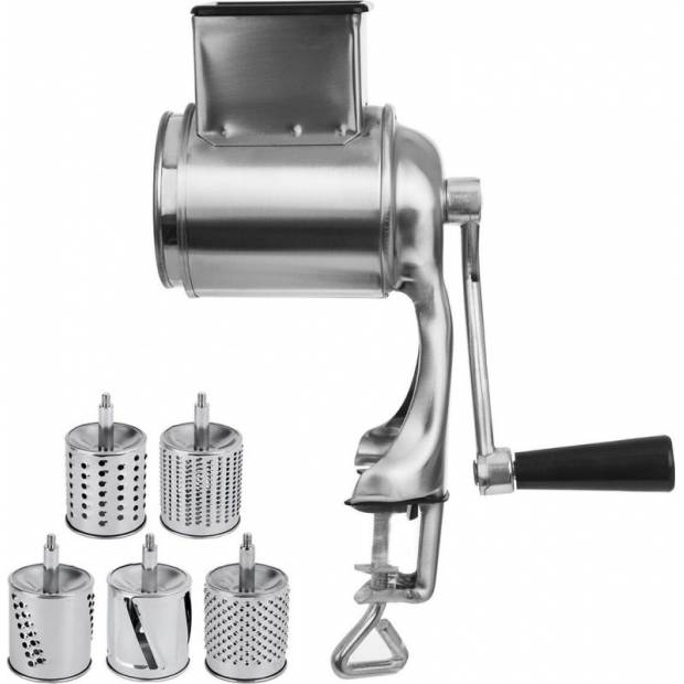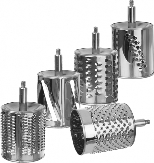 Mlýnek s 5 nástavci, který pomůže snadno nastrouhat na jemno strouhanku, piškoty, ořechy, mandle, tvrdý perník, sýr nebo okurky na plátky. Má nerezové tělo s nástavci, mlecí mechanismus je poháněn ručně pomocí kliky.