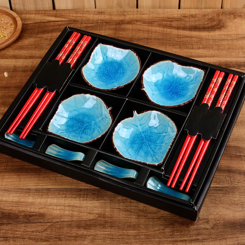 Elegantní sada talířů na sushi. Modrá barva a pravidelné tvary talířů v podobě listů, pěkné podložky na hůlky ve tvaru listů. Krásná sada nádobí pro orientální večeři. Ideální také jako dárek pro milovníka sushi.
