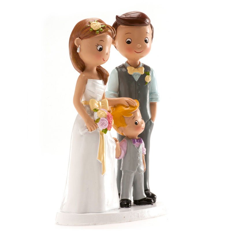Elegantní sváteční ozdoba je ideální pro zdobení svatebních dortů. Svatební figurka je jednoduché a elegantní řešení pro zdobení dortů. Hlavními postavami této dekorativní figurky vyrobené z pryskyřice jsou novomanželé s malým chlapečkem. Vyznačuje se spontánním, zábavným a elegantním stylem. Splňuje všechny požadavky evropských norem a je vhodná pro styk s potravinami. Výrobek je vhodný pro profesionální použití v cukrárnách. Tato nejedlá dekorace se dá využívat opakovaně, můžete si ji schovat jako vzpomínku na váš svatební den. Výška 16 cm.