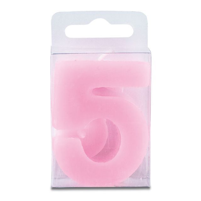Svíčka ve tvaru číslice 5, růžová barva, výška 4 cm. Je vhodná především pro zdobení narozeninového dortu a podobných moučníků. Svíčka splňuje všechny bezpečnostní předpisy.