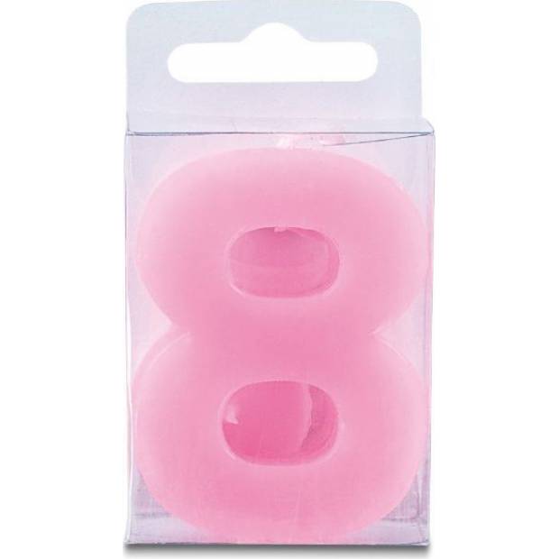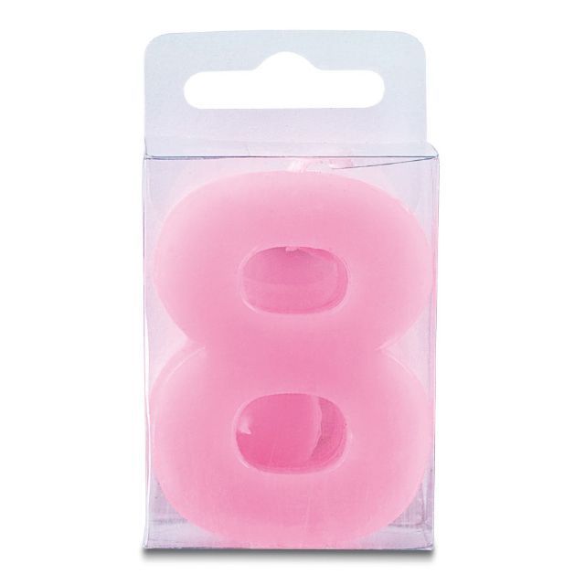 Svíčka ve tvaru číslice 8, růžová barva, výška 4 cm. Je vhodná především pro zdobení narozeninového dortu a podobných moučníků. Svíčka splňuje všechny bezpečnostní předpisy.