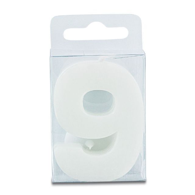 Svíčka ve tvaru číslice 9, výška 4 cm, bílá. Je vhodná především na narozeninový dort a zdobení podobných moučníků. Svíčka zcela splňuje všechny bezpečnostní předpisy.