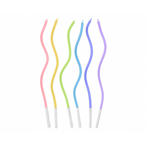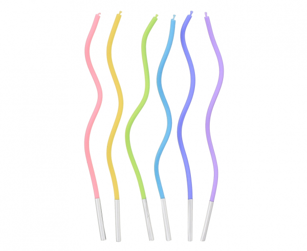 Svíčky na dort ve veselých barvách mají zajímavý zakroucený tvar. V balení 6 ks svíček.