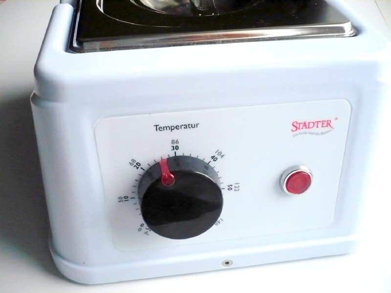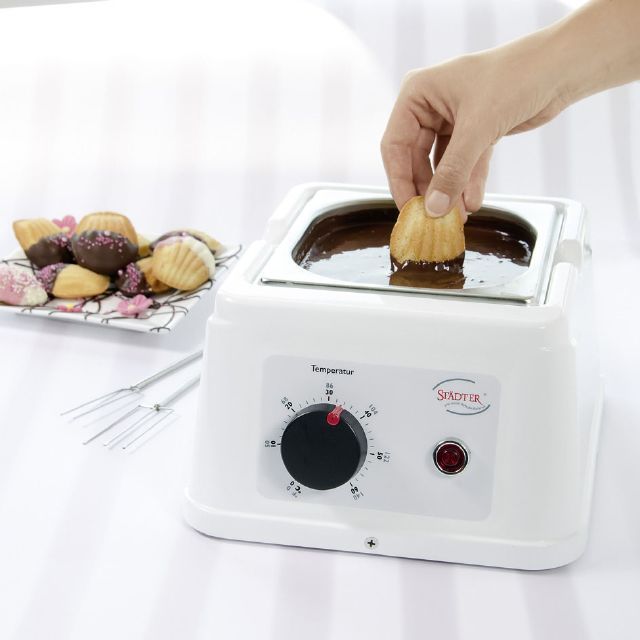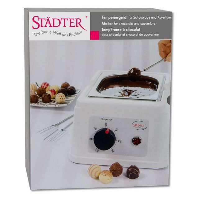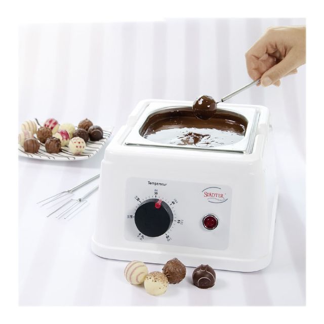 Pokud rádi a často pracujete s čokoládou, tak temperovací přístroj Vám usnadní práci a stane se Vám nepostradatelným pomocníkem. Nejen že v něm čokoládu vytemperujete na potřebné hodnoty dle druhu, ale díky stálému udržování teploty můžete s čokoládou pracovat podstatně déle. Přístroj má vyjímací nezerovou nádobu s víkem o objemu 1500 ml, měřeno až po okraj. Teplota se dá plynule regulovat až do 60°C a přístroj nahřívá celou vnitřní nádobu po dně i bocích.
