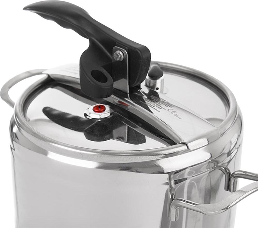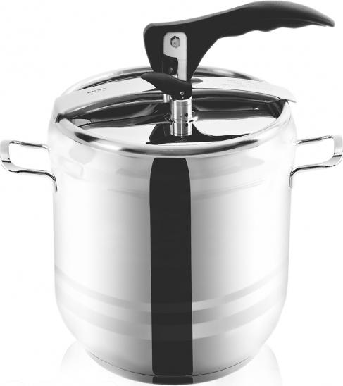 Tlakový hrnec s tlakovou poklicí rovného tvaru je opatřen silným 3vrstvým akutermickým dnem, které díky svým vlastnostem spoří výrazně tepelnou energii i čas strávený při přípravě pokrmů. Hrnec je opatřen pružným víkem s tvarovanou rukojetí a bezpečnostním a pracovním ventilem pro upouštění tlaku. Max. výška naplnění hrnce je vyznačena z vnější strany nádoby. Součástí návod s uvedenými časy pro přípravu vybraných potravin. Materiál: nerez ocel, bakelit. Rozměry: objem celé nádoby (ne objem pracovní) 9 l, pr. 21 cm, v. 25,5 cm. Hrnec je vhodný na všechny typy tepelných zdrojů. Tlakové hrnce jsou opatřeny speciálním třetím silikonovým ventilem, který slouží jako další pojistka pro případ, kdyby oba standardní ventily selhaly. Při tlaku převyšujícím 2 bary se tento ventil sám uvolní, aby mohlo dojít ke snížení tlaku v nádobě a nedošlo k jejímu poškození či vymrštění víka. Silikonový ventil je umístěn pod přítlačným mechanismem víka tak, aby při uvolnění neohrozil nikoho v bezprostřední blízkosti hrnce. Jedná se o technickou novinku zajišťující větší bezpečnosti spotřebitele. Náhradní těsnění v naší nabídce 180510.