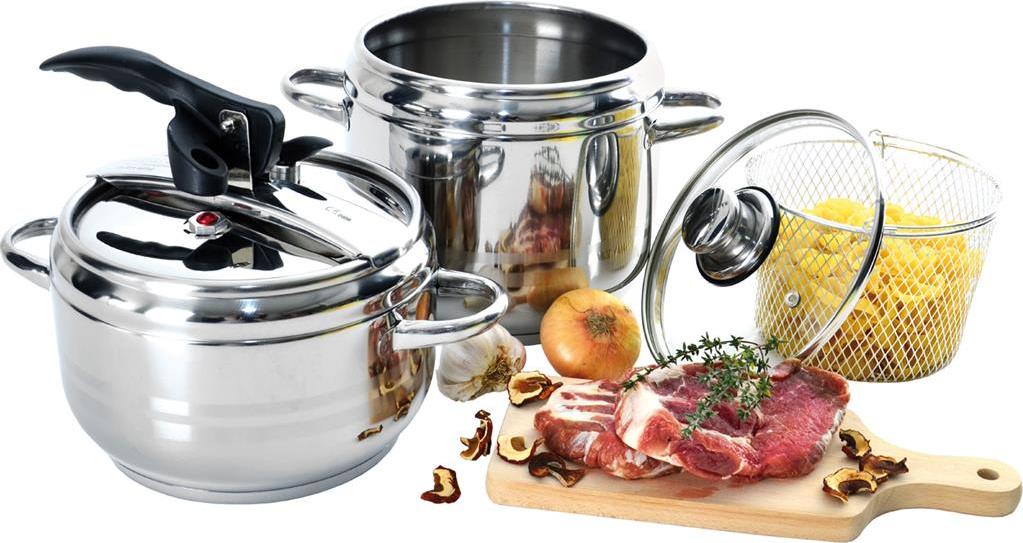 Tlakové hrnce DUO 3,5+5 l-souprava dvou hrnců s jednou společnou pružnou tlakovou poklicí s bezpečnostním a pracovním ventilem pro upouštění tlaku. Součástí hrnce je i skleněná poklice a nerezový košík na cezení uvařených potravin. Hrnec je opatřen silným 3vrstvým akutermickým dnem, které díky svým vlastnostem výrazně spoří tepelnou energii i čas strávený při přípravě pokrmů. Max. využitelný objem-hladina je označen uvnitř hrnce. Uvádíme objem celé nádoby (ne objem pracovní). Součástí je návod s uvedenými časy pro přípravu vybraných potravin. Hrnec je vhodný na všechny typy tepelných zdrojů. Tlakové hrnce jsou opatřeny speciálním třetím silikonovým ventilem, který slouží jako další pojistka pro případ, kdyby oba standardní ventily selhaly. Materiál: nerezová ocel, bakelit, silikon. Rozměry: objem tlakových hrnců 3,5 l a 5 l, průměr 20 cm, výška 13 cm a 17 cm, košík pr. 15 cm, v. 10,5 cm. Jsou vhodné do myčky nádobí. Náhradní těsnění v naší nabídce 180541.