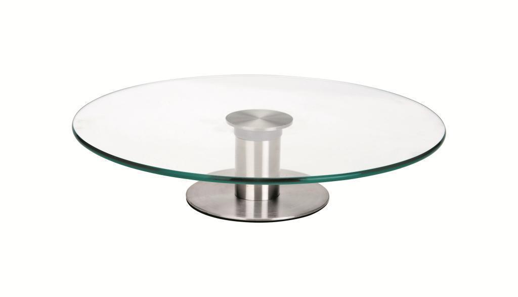Speciální otočný stojan na zdobení dortů, koláčků a nejrůznějších pochutin. Praktický výrobek z nerezové oceli a skla.