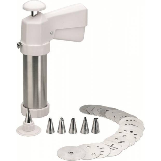 Kvalitní trezírovací pistole na sušenky, nebo cukroví, je vyrobena z nerezové oceli a plastu. Součástí balení je šest zdobítek a několik šablon s odlišnými dekory, jež vám vytvoří naprosto originální a kreativní obrazce. Těstoviny, cukroví či jiné pochutiny tak můžete tvořit s maximální nápaditostí. Výsledný vzhled pochutin bude zcela originální a jedinečný.