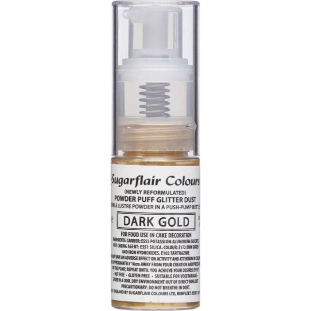 Dokončete své výtvory pomocí rozprašovače Sugarflair s třpytivým prachem. Tento sprej se snadno používá a je skvělý na zdobení cupcaků, dortů, dekorací a mnoho dalšího. Jak používat: Držte cca. 10 cm od vašeho výtvoru a zatlačte na pumpičku, opakujte, dokud nedosáhnete požadovaného efektu. Na každý 1 kg dortu a ozdoby byste neměli použít více než 2 gramy barvy. Tento sprej funguje na vzduchu a neobsahuje alkohol.
