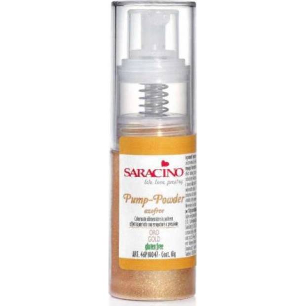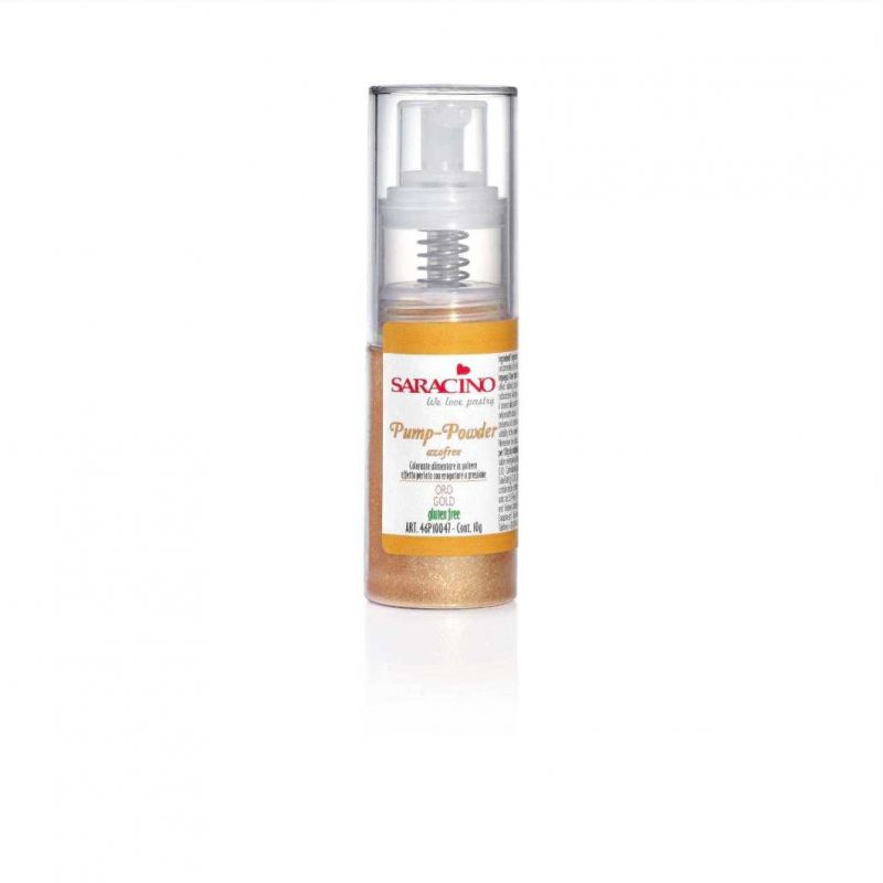Potravinářské barvivo ve spreji je zlatý bezlepkový prášek s jednoduchým použitím. Nastříkejte toto práškové potravinářské barvivo na požadovaný povrch, který chcete dekorovat. Ideální produkt pro zdobení čokolády, výrobků na bázi cukru, kakaového másla, mandlové pasty atd. Jedná se o novinku v odvětví pečiva, prakticky by se jednalo o práškové barvivo, balené ve speciálním balení, které umožňuje nastříkat produkt a vytvořit tak fantastické třpytivé efekty.