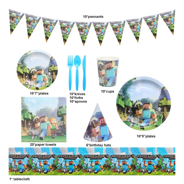 V tomto setu najdete ubrus,10 talířů, 10 příborů, 20 papírových ubrousků, 10 papírových kelímků, 6 narozeninových čepic, 10 menších papírových talířů, vlaječkové girlandy. Super praktická sada společenského nádobí s motivem Minecraft: všechny talíře, ubrousky a kelímky jsou vyrobeny z vysoce kvalitního odolného papíru a snadno pojme jakýkoli druh jídla nebo pití, aniž by vytekly. Jsou dostatečně robustní, aby je bylo možné používat i mimo stůl. Narozeninový set byl jedinečně navržen tak, aby obohatil nejen dětské sny a poskytl jim fantastické překvapení. S originálními kreslenými vzory vypadají tyto talíře, šálky a další dekorace naprosto úchvatně. Jedná se o skvělý výběr doplňků pro narozeninovou oslavu. Snadné použití vám zajistí rychlý úklid po večírku. Vhodné pro mnoho příležitostí: Potřeby pro narozeninovou oslavu s libovolným motivem lze použít pro různé příležitosti, jako jsou dětské oslavy, narozeniny, Vánoce, svatby, pikniky, tématické večírky a rekvizity pro fotobudky, atd.