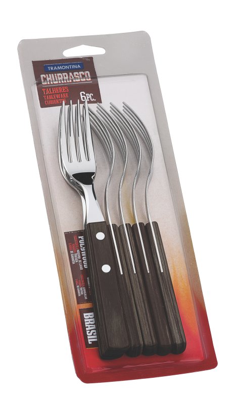 Co by bylo tradiční grilování bez správného příboru? Vyvážené vidličky na steaky TRAMONTINA jsou vyrobeny nerezové oceli AISI 430, která odpovídá DIN 1.4016, a jsou ideálním doplňkem k nožům na jumbo steaky. Rukojeť je vyrobena z opravdového dřeva odolného proti nárazům a má krásnou dekorativní barvu. Za tímto účelem bylo několik vrstev borovicového dřeva impregnováno pryskyřicí a poté lisováno, nařezáno do tvaru a vyleštěno. Díky vynikající kvalitě a vysoké odolnosti je tato sada na grilování použitelná i v myčce na nádobí a zachovává si svůj atraktivní vzhled i po častém používání. Šestidílný set vidliček je nezbytný doplněk perfektního grilovacího vybavení pro každého milovníka steaků a BBQ. Lze je doplnit o nože, které zakoupíte i v našem eshopu.