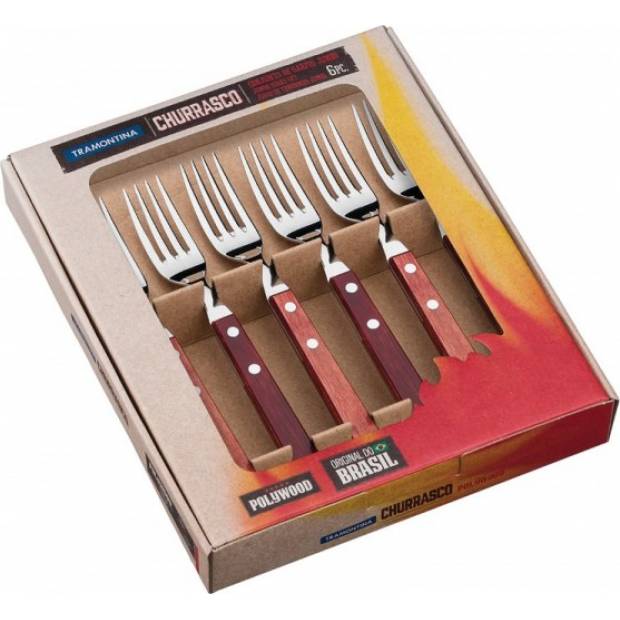 Co by bylo tradiční grilování bez správného příboru? Vyvážené vidličky na steaky TRAMONTINA jsou vyrobeny nerezové oceli AISI 430, která odpovídá DIN 1.4016, a jsou ideálním doplňkem k nožům na jumbo steaky. Rukojeť je vyrobena z opravdového dřeva odolného proti nárazům a má krásnou dekorativní barvu. Za tímto účelem bylo několik vrstev borovicového dřeva impregnováno pryskyřicí a poté lisováno, nařezáno do tvaru a vyleštěno. Díky vynikající kvalitě a vysoké odolnosti je tato sada na grilování použitelná i v myčce na nádobí a zachovává si svůj atraktivní vzhled i po častém používání. Šestidílný set vidliček je nezbytný doplněk perfektního grilovacího vybavení pro každého milovníka steaků a BBQ. Lze je doplnit o nože, které zakoupíte i v našem eshopu.