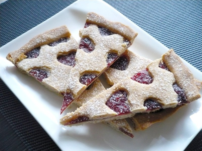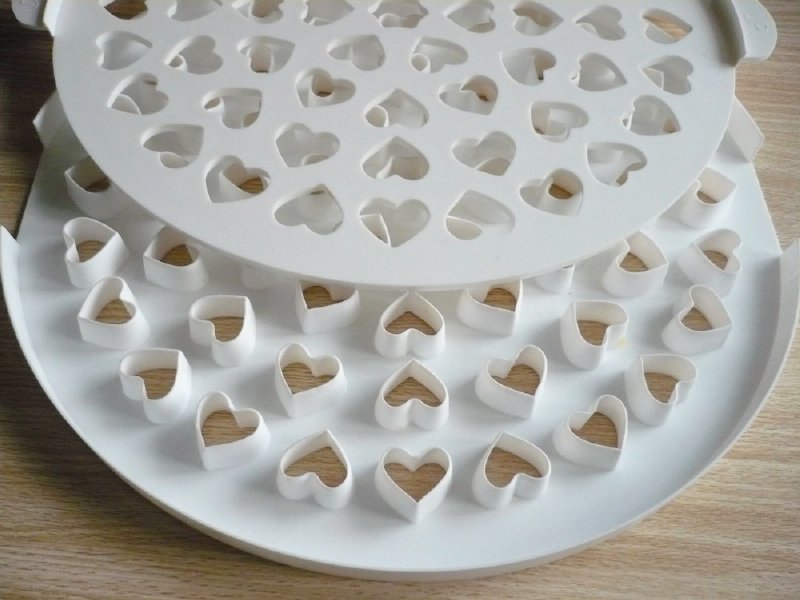 Vykrajovací forma z tvrdého plastu se skládá ze dvou dílů. Jeden díl slouží k vykrojení těsta ve tvaru malých srdíček a druhý pak slouží jako podložka k lehkému přenášení na moučník. Tento díl má úchyty a moc dobře se s ním manipuluje. Forma se může použít na koláče o průměru 30 cm a menší. S formou se moc dobře pracuje, vyzkoušela jsem ji při přípravě sladkých koláčů z lineckého, křehkého a tvarohového těsta. Připravené těsto se nechává zabalené ve fólii odležet v chladu. Může se připravit jak světlé, tak i tmavé, s ořechy atp. Na obalu produktu je fotonávod a zde se můžete podívat i na video postupu přípravy.