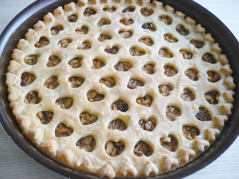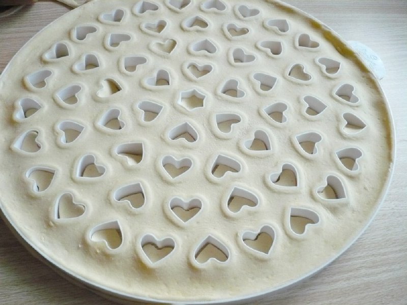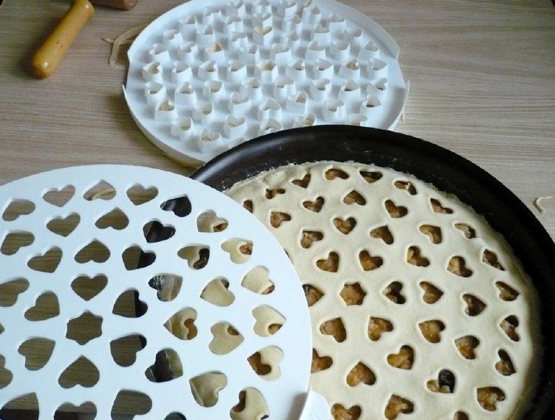 Jako první se oba díly správným způsobem zasunou do sebe. Dolů patří vykrajovací forma a na ni se přidá druhý díl sloužící pak jako podložka k přenášení. Přes menší cedník se shora lehce popráší hladkou moukou a položí se vyválené těsto o žádaném průměru dle koláčové formy. Na povrch koláče stačí vyválet menší polovinu z připraveného těsta. Pracujeme se studeným těstem, jinak pak na formě položené těsto odložíme na chvíli do chladu. Alespoň mně se to osvědčilo. Větší polovinu těsta taktéž rozválíme do kruhu, vyložíme jím velmi lehce tukem vymazanou koláčovou formu a uděláme vyvýšené okraje. Přidáme jakoukoliv náplň a tu na povrchu uhladíme. Můžeme použít třeba jen marmeládu, jablečnou náplň nebo jinou ovocnou, tvarohovou, makovou, hustý pudink atp. Když máme vše takto připraveno, vyjmeme z chladu vykrajovací formu s vyváleným těstem nahoře a po těstě důkladně přejedeme delším válečkem, třeba vícekrát. Tím nám vzniknou srdíčkové otvory. Za pomocí úchytů nadzvedneme horní podložku s těstem a těsto z podložky přesuneme na připravený koláč. Pak upravíme okraje, třeba je lehce přetřeme malým štětečkem vodou a použijeme na vytvarování okraje vykrojená srdíčka. Díky malému množství vody se přilepí a neodpadávají. Nebo vykrojená srdíčka zpracujeme do koule a vyválíme do dlouhého válečku a tím okraj začistíme, ale lépe vypadají srdíčka. Připravený koláč vložíme do předehřáté trouby a upečeme.