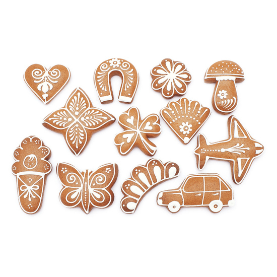 Vykrajovačky jsou zhotoveny ze zdravotně nezávadného a dostatečně odolného pocínovaného plechu, horní okraj je pro lepší udržení tvaru i bezpečnost při práci s nimi přehnut a tím zdvojen, takže tvoří oblou hranu. Mezi motivy najdete například podkovu pro štěstí, autíčko, letadlo, hříbek, motýla, miminko v zavinovačce, vějíř, trojlístek, srdíčko z lásky, květ nebo vzor s lístky. Výsledné tvary budou střední velikosti, použitelné samostatně jako zákusky nebo přílohy ke kávě či čaji, lze je ale použít i při zdobení dortů nebo jiného svátečního pečiva.